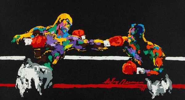 LeRoy Neiman made this painting of Rocky with what looks like oil paint, and maybe some acrylic, applying it in short, energetic strokes. The colors aren't exactly realistic, but they sure do capture the energy of the subject, don't they? Looking at the surface of the painting, you can see how thick the paint is in some areas, like around the gold belt. Neiman really lets the texture of the paint do some of the work, giving the painting a kind of visceral, almost sweaty feel. Then notice the bold red of the boxing gloves. The bright color really pops against the blue background, doesn't it? It adds a sense of urgency, maybe even a little danger. Neiman’s loose, expressive style reminds me a little bit of Joan Mitchell, but with a Pop Art twist. But unlike Mitchell's abstract landscapes, Neiman's always got a specific subject in mind. Both artists remind us that painting is always a conversation, one big, messy, beautiful conversation.