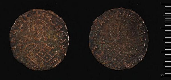 Curator: Here we have an Anonymous Follis from the Harvard Art Museums. It’s authorless, and we don’t know its exact date. Editor: It looks ancient, like something dredged up from the bottom of the sea! What kind of stories could it tell? Curator: Exactly! Though humble in size, these coins were crucial in Byzantine economic life. Their imagery carries a lot of weight. Editor: Definitely! The wear and tear feel like layers of history, each scratch and fade a whisper of past transactions, the rise and fall of fortunes, maybe even love affairs. Curator: That's a beautiful way to put it! This little disc, once clutched in someone's hand, now sits quietly, a link to a world so different and yet still so human. Editor: A tangible echo. Holding something like this really makes you feel the weight of time, doesn't it?