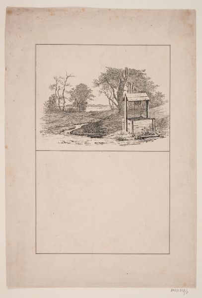 Editor: This is Alexandre Calame’s "A Log Cabin; An Overgrown Fence". I’m really struck by the contrast between the crafted architecture and the wildness of the vegetation. How do you read the composition? Curator: The composition hinges on a dichotomy between constructed form and organic growth. Notice how Calame uses line weight to differentiate the precise geometry of the cabin from the more chaotic, textural rendering of the surrounding foliage. Editor: So, the contrast isn't just thematic, it's built into the very techniques? Curator: Precisely. Consider the use of hatching and cross-hatching in the foliage versus the clean lines defining the cabin's structure. It’s a study in opposing formal strategies. Editor: That’s a really interesting point, I hadn't noticed how deliberately he manipulated the line work. Curator: Indeed. By contrasting these visual elements, Calame constructs a visual narrative about the relationship between humanity and nature. Editor: Thanks, I'll definitely look for that in other landscapes.
