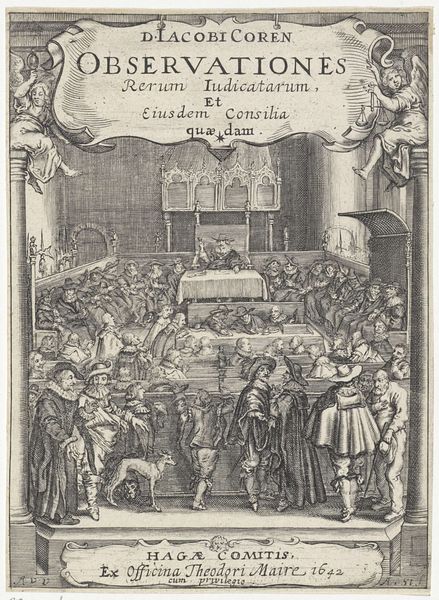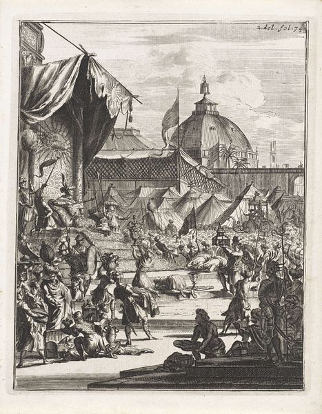 Curator: This is an engraving from around 1700, titled "The Martyrs of Alkmaar Hanged in Enkhuizen, 1572." It commemorates a dark chapter of Dutch history during the Eighty Years' War. Editor: What strikes me immediately is the chilling contrast between the elaborate architectural backdrop and the brutal scene unfolding in the foreground. The lines are so precise, creating a sense of detachment despite the violent subject matter. Curator: Precisely. The architecture provides a spatial context, locating the event in a specific place, but it also emphasizes the power structures at play. The figures in the balconies looking down. It serves to emphasize the public and politically charged nature of these executions. Editor: Look at the layering of the scene: we have figures watching from the balconies and the victims suspended in the mid-ground, and still more corpses in the water in the very front. A formalist's perspective could look closely at how it compels the eye across a terrible landscape. The rigid horizontals and verticals add to a feeling of cold order. Curator: Indeed, the Baroque style of the print, with its sharp detail, actually heightens the emotional impact rather than softening it. The engraver is emphasizing the harsh realities faced by those who resisted Spanish rule and were, as a result, killed. This was part of the political and religious battle of the time. Editor: I think that by using such highly stylized elements, the artwork speaks to a bigger question of conflict: that it uses pattern and detail to talk about the place of death. Look at how the light creates hard patterns even on those hanged figures; their deaths are part of an overall organized perspective. Curator: The engraving is more than a depiction of violence. It’s a statement on religious freedom, political resistance, and the human cost of war. It provided a potent visual symbol for the Dutch struggle for independence and played a role in constructing the Dutch national identity. Editor: For me, this print succeeds by virtue of the many ways to find meaning from a difficult visual arrangement; one could look for historical lessons or, by contrast, ask questions about its many levels and structured line work. Curator: Indeed, this work reminds us that art can function as historical record and powerful political statement. Editor: And that even the darkest subjects can be mined for form and texture.