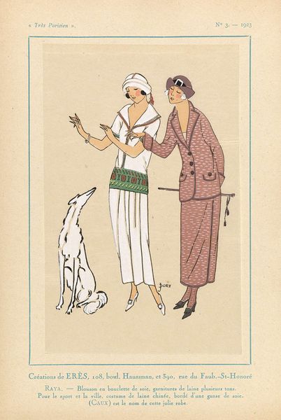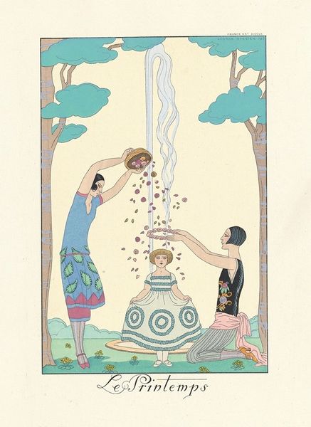 George Barbier made this fashion plate, L’Été, sometime in the 1920s with watercolor and ink on paper, and right away, I notice the way he uses thin, washy colors to evoke a sense of summer. It's interesting how the light touch of the watercolors gives everything a kind of breezy, effortless feel, like sketching in a notebook by the beach. Looking closely, you can see where the colors bleed softly into each other, creating subtle gradients and shadows that give depth to the figures and the landscape. The color palette leans towards pastels – soft pinks, oranges, and greens – that evoke a feeling of warmth and leisure. I'm drawn to the way Barbier uses the ink lines to define shapes and add a sense of graphic clarity to the composition. It reminds me a little of Erté, with his focus on elegant, elongated figures and intricate patterns. But there's something uniquely Barbier about the way he combines the delicate watercolor washes with the crisp ink lines, creating a balance between spontaneity and control. In art, like life, there are no fixed or definitive meanings.