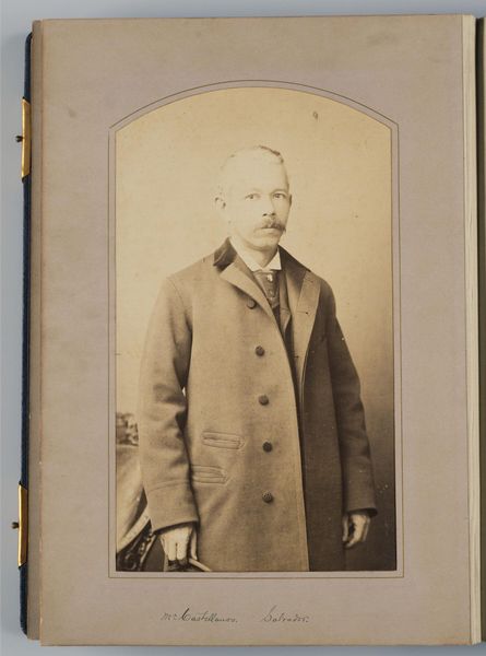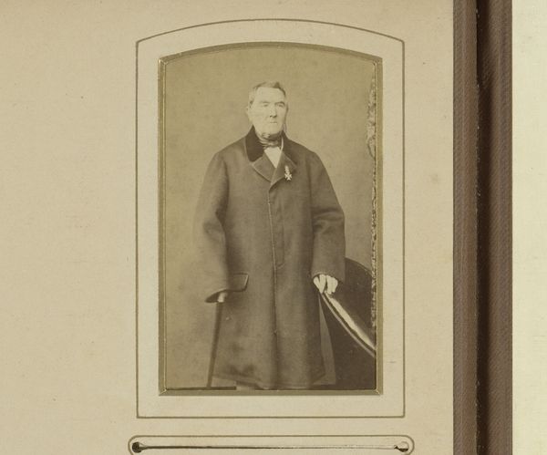 Curator: Henri Blanckart's "Portret van een staande man met zijn hand in zijn overjas gestoken," dating to sometime between 1863 and 1894, is a compelling study of bourgeois masculinity. Editor: The immediate impact is the formality, wouldn’t you agree? The restrained palette, the classical Greek key pattern in the background… it all speaks of carefully constructed self-presentation. Curator: Exactly. This portrait resonates with late 19th-century class anxieties, the performance of respectability, and the silent assertion of authority prevalent in Europe’s middle class. Consider the semiotics of the overcoat, how the partially obscured hand alludes to inner reservations— Editor: The man is quite literally buttoned up! Visually, it's all verticals and near perfect symmetry. His gaze is level, but doesn’t quite engage, resulting in the impression of aloof detachment. The pose draws your eye up to the head—the clear focal point, with its striking contrast. Curator: The very act of commissioning such a portrait implicates participation in a specific societal performance, suggesting perhaps a desire for social elevation or memorialization within this established milieu. And there’s that hint of vulnerability, a fissure perhaps in the performance. Editor: I think we can go further than that... Blanckart really maximizes the possibilities of depth available to him in this image. It's striking that even through what is inevitably a fairly restricted tonal palette in monochromatic photography, we gain real texture. The light defines him! Curator: This encounter prompts reflections about how gender, status, and even hidden emotions intertwine in our construction and projection of the self, and also about the power of visual imagery to solidify—or challenge—entrenched narratives. Editor: Absolutely. By attending to these subtle details, the viewer becomes aware of the rich expressive vocabulary of the medium itself, not just the societal signals. Each choice is precisely calibrated.