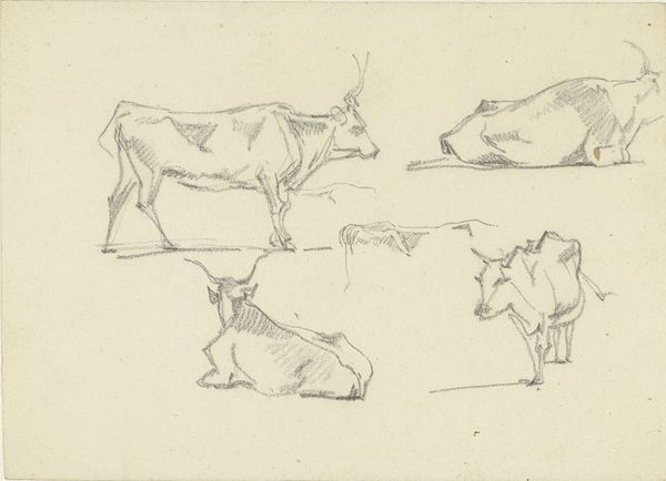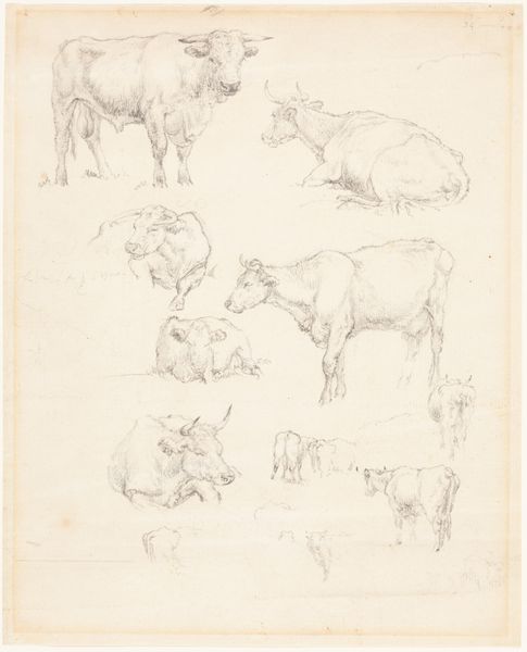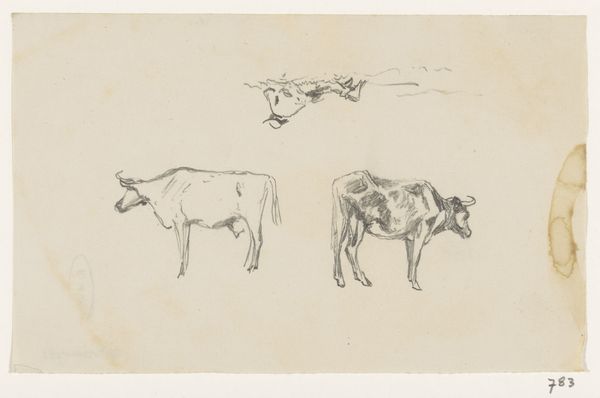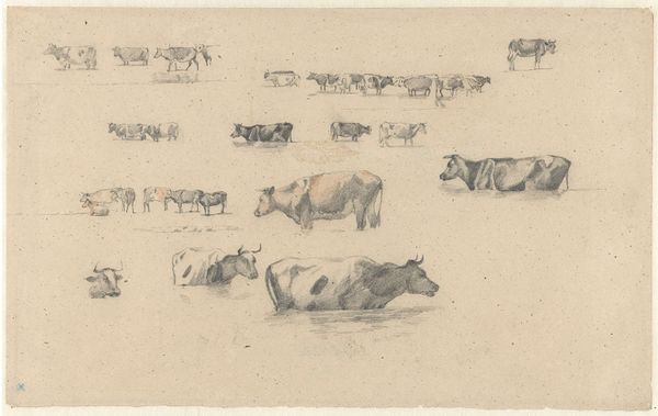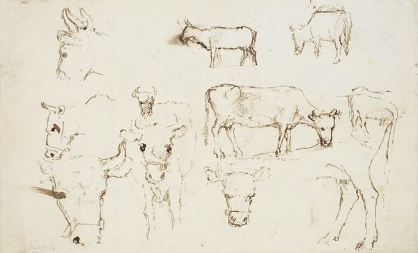 Curator: So, we're looking at Walt Kuhn's "Cows [recto]" from 1913, an ink on paper drawing. He dedicated it to John Quinn. My immediate impression is the artist's hand having a moment of whimsy, almost as if capturing a fleeting pastoral dream. What strikes you first? Editor: Well, those quick, almost frantic lines immediately make me think about the changing landscape of early 20th-century America. Industrialization was ramping up, pushing these agricultural scenes – these cows – to the margins, so an artistic genre like this highlights a nostalgic, and arguably, increasingly marginalized lifestyle. Curator: Margins, yes! Yet the playfulness of the lines – the cow almost tipping over, the sailboat squeezed up in the corner – it’s not necessarily about deep melancholy. It almost feels like he is remembering a happier place and time but acknowledges it's becoming fragile or distant. Editor: I agree there's playfulness, but even that reads as complicated. Kuhn was deeply involved with the Armory Show that year, pushing radical European Modernism onto the American art scene, even though subject matters were distinctly American. The gesture, I believe, underscores an important conflict within the American artistic identity during that time. The American "spirit" against what they may have deemed the foreign artistic tradition? Curator: That’s a provocative thought. So this humble sketch is actually doing all that political and cultural work? It is like, he knew of something special but it needed the light, it needs the artistic traditions. A little tug, you see. Look at these scribbles. I love those details. Editor: Absolutely! This wasn't just about idyllic scenes; it’s about the entire project of defining American identity, who gets included and excluded, which aesthetics become privileged and why. And these supposedly simple sketches served as powerful reminders and markers of those tensions. Kuhn did indeed place the pastoral sketches in tension against avant-garde ideas. Curator: This piece is now lingering differently in my imagination. Those playful lines are charged in new ways. Now there are so many worlds existing there on the piece. Editor: And that interplay between observation, style, and sociopolitical undertones is what makes engaging with artworks like this continually exciting. Curator: Beautiful, and this back-and-forth, of course, that is where it sings!