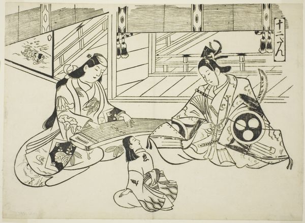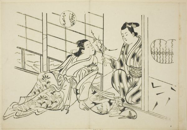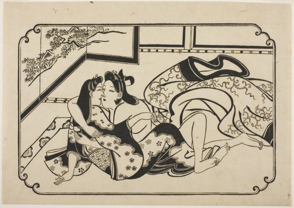 Curator: This image, held here at the Art Institute of Chicago, comes from Hishikawa Moronobu, active in the latter half of the 17th century. Titled "A Courtesan with Her Client, the first sheet of an untitled erotic picture album," it gives us a glimpse into ukiyo-e printmaking during the Edo period. Moronobu utilized ink on paper. Editor: Well, right away I'm struck by how much the patterning seems to define the space— the grid of the doorframe against the organic waves in the screen and then of course the robes themselves. It’s decorative, yet it creates this feeling of intimacy. Curator: It does speak to the compartmentalization of pleasure within carefully prescribed social structures. Moronobu, of course, emerged during a transformative era. The rise of the merchant class created new audiences for art, moving it away from the aristocracy, though those strict social divisions remain visible in the imagery itself. Editor: Absolutely. And the courtesan is never presented outside the bounds of an arranged setting. Her presentation—downcast eyes, formal pose even when intimate— speak to the way these women negotiated power within that structure through gesture and controlled eroticism, which is a potent symbol of controlled sensuality. The symbolism there is intense, it mirrors Japanese screen paintings that represented sexual liberation as a form of rebellion Curator: Interesting interpretation. Though the rise of these prints contributed to solidifying certain societal hierarchies in these images. In this case the figures occupy a private sphere, meant only for the client’s pleasure, and that shapes the political realities as well. We are seeing through a keyhole. These are men’s images, for male consumption. Editor: Perhaps, but the client, here is rendered somewhat vulnerable; nearly upside-down and in a rather less controlled pose that his companion. Maybe she possesses control of her own sexuality and presentation as a sign of rebellion within this world? Curator: Well, whatever way one looks at the figures, their clothing patterns, this intimate exchange, became commodities in a sense. Ukiyo-e democratized art, but also cemented certain social views that are well for discussing even now. Editor: Exactly. Visual codes always operate on multiple levels. It really underscores how much these images communicate about desire, class, and power in that era. Curator: Precisely, a lot to think about beyond just the initial erotic appeal, wouldn't you agree? Editor: Yes, this makes one see the images in entirely different lights, certainly something worth reflecting on.