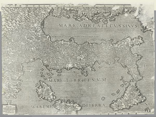 Abraham Ortelius created this map of Greece, titled "Kaart van Griekenland," using engraving techniques. Initially, one notes the subtle contrast between the landmasses, rendered in varying shades of green, and the surrounding bodies of water, depicted in soft blues. The formal structure of this map reveals more than geographical data; it embodies the era's understanding of space and knowledge. Notice the decorative cartouches—the ornamental frames containing the map's title and other information—which flank the edges of the composition, and the stylized presentation of topographical features. These elements function as signs, pointing to the cultural values placed on classical learning and exploration. The map's reliance on visual symbols speaks to a semiotic system where each element conveys specific information while also contributing to an overall aesthetic experience. Ortelius’s map is not merely a tool for navigation but a complex representation of how the world was perceived. It uses a visual language to assert control over the unknown, structuring knowledge within a grid of lines and symbols.