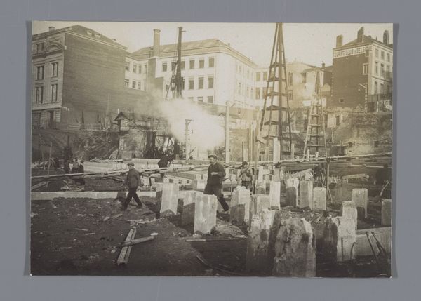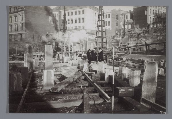 This is 'Bouwwerkzaamheden in Brussel, België’ by Wesseling, a photograph probably made with a large format camera. Look at the scale, the depth of field, the tones of grey, black and white – how they almost cancel each other out in a haze of industry. The photograph is a dense layering of shapes and textures, capturing a construction site bustling with activity; the materials and the machinery of labor. The dark foreground gives way to a complex middle ground of scaffolding, brickwork, and then a soft background featuring buildings shrouded in mist. If you zoom in you can almost hear the sounds of construction: the hammering, the grinding, the shouts of workers. The overall effect is one of constant motion and progress, like an early modernist painting by Fernand Léger. But it also anticipates the dystopian industrial landscapes we know today. Either way, it is a fascinating window into a past of hard labour and human energy.