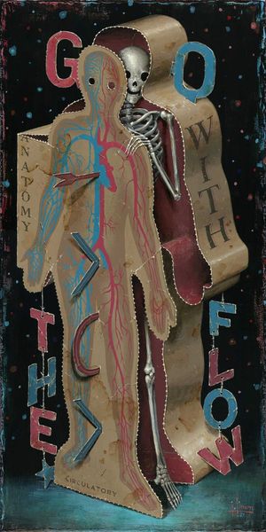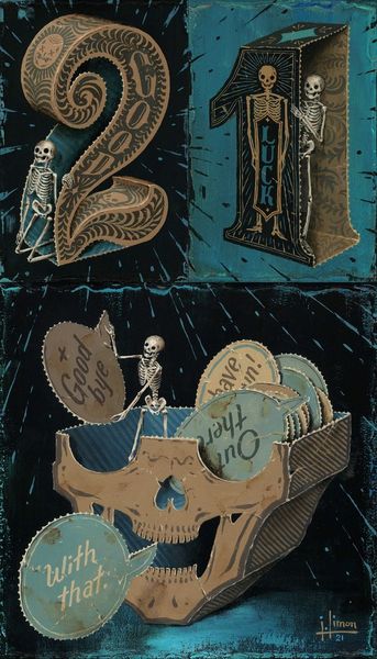 Editor: Jason Limon's "Going Nowhere," from 2020, appears to be a mixed-media piece. The somber skeleton and the decaying alphabet blocks give it a slightly ominous feel. What stands out to you about this work? Curator: Considering the material context, look at how Limon uses mixed media – presumably acrylic paint alongside other materials to build texture. The very *making* of this piece, the layering and juxtaposition of different media, it emphasizes a construction – or perhaps a deconstruction. He presents us with signs and signifiers--language, alphabets--that promise meaning but, here, fail to deliver. Editor: So, the materials contribute to the overall feeling of decay and stalled meaning? Curator: Exactly. The "going nowhere" of the title isn't just a thematic statement; it's embodied in the laborious construction of the work. Each block seems hand-crafted and then deliberately distressed, which requires significant labor that leads nowhere. Also, the small skeletons seem like artisans and laborers, reinforcing the themes of making and undoing. What kind of cultural messages are delivered by graffiti art? Editor: You mean the "street art" look? Maybe about undermining authority or commenting on capitalism. Curator: Precisely! Limon appropriates the visual language associated with that cultural practice, which offers commentary about dismantling language as systems of meaning-making. Look at the font selections, for example; or the way the skeletal figures engage with the alphabet blocks as a form of industry. Editor: So, he's using the medium and the making of the piece itself to comment on broader social themes, on capitalism? That’s something I didn’t initially consider! Curator: Absolutely. By understanding his choices of process and materials, we realize that the medium *is* very much the message. Editor: I definitely see it now. I had been so focused on the skeleton, I didn't consider how much the method and material adds to the overall impact of the artwork. Curator: Indeed. Recognizing materiality invites us to interpret how artistic intention can be materialized by diverse mediums and material combinations to enhance a work of art's commentary about modern cultures and societies.
