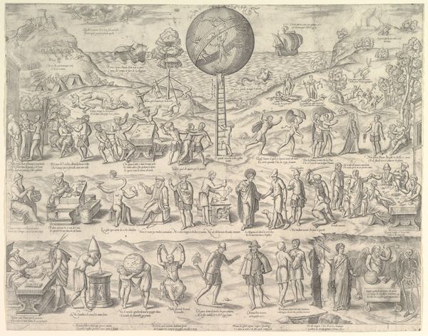 Curator: It strikes me as an ambitious composition. At first glance, it's overwhelmingly detailed, even chaotic, yet there's also something calming about its linear quality and the muted tones of the print. Editor: Indeed. What you're observing is characteristic of Northern Renaissance art, which often married the earthly and the divine in such ways. This ink drawing/print created sometime between 1565 and 1567 by Philips Galle is entitled "The Lord Assigning Duties to the Three Estates". Galle attempts to present an ordered worldview of social structure divinely ordained. Curator: "Divinely ordained" hits the nail on the head. Look at how carefully he has structured it. God and the elect in the Heavens at the top. Below that, the “three estates”— Nobility, Clergy, and Commoners— with each group further stratified by size, perhaps reflecting social rank and power, seemingly drawing power from above. What could those "duties" be that he is referencing? Editor: In sixteenth-century social and political thought, the 'duties' refer to the specific roles and responsibilities assigned to each social class. The nobility, for example, had a duty to provide governance and military protection; the clergy provided spiritual guidance; and the commoners, essentially everyone else, were responsible for labor, supporting the other two estates. The very imagery of a divine figure assigning such duties reinforced social order and hierarchy. Curator: It's a compelling way to visualize societal structure and values, the symbolism resonating far beyond its time, the same social constructs exist in current times in subtle ways, though there may have been shifts on the focus on nobility, or perhaps expanded versions of 'clergy'. However, this piece could easily be seen as oppressive as well, given the time of history that it stems from. Editor: Absolutely, this representation underscores power dynamics. But more than oppression, I think this drawing acted as propaganda of its time; and was crucial in shaping public perception. It made those hierarchical systems seem not only natural but part of a divinely sanctioned order, it influenced social behavior at its root. The layers and detail reinforce these hierarchies and thus promote them. Curator: Thank you, it offers a crucial snapshot into societal norms and values of the period. Seeing these images together definitely helps us connect more deeply with history and contemplate societal shifts over time. Editor: It certainly urges one to consider art’s vital role not merely as a mirror reflecting reality but also as an active agent shaping our understanding of the world around us.