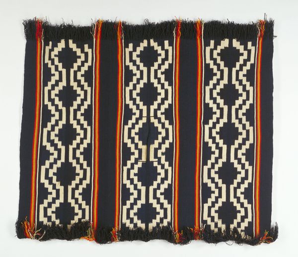 Editor: We're looking at a Serape, created around 1900, possibly in Saltillo. It's textile art, woven from cotton and pigments, now held at the Minneapolis Institute of Art. The intricate patterns are really striking! How should we interpret its visual impact? Curator: What jumps out to me is how the materiality speaks to its social context. Consider the labour involved in producing such a textile. The sourcing of the cotton, the preparation and application of the dyes – probably natural pigments at this time – the weaving itself. These were skilled processes, often deeply embedded in Indigenous economies and family structures. Editor: So, the value isn't just in the final product but in understanding its production? Curator: Exactly. We need to think beyond aesthetic appreciation to consider the conditions of its making. What tools were used? Were these local or imported? What trade networks supported the availability of these materials? And how did the production and distribution of serapes intersect with colonial power dynamics at the turn of the century? These objects existed as expressions of indigeneity within an increasingly industrialized world. Editor: It makes you think differently about how an object carries its history! What about the pattern, would that speak to cultural influences of the time? Curator: Certainly! The geometric designs aren't just decorative; they likely carry cultural meanings specific to their makers, modified or impacted through material availability. Thinking materialistically urges us to remember these patterns as being generated, maintained, and passed down through real individuals involved in acts of labour. Editor: That’s fascinating; I had never considered how deeply labour and materiality influence how we perceive cultural value. Thank you. Curator: My pleasure. Recognizing art’s grounding in real-world conditions offers new lenses to see culture anew!