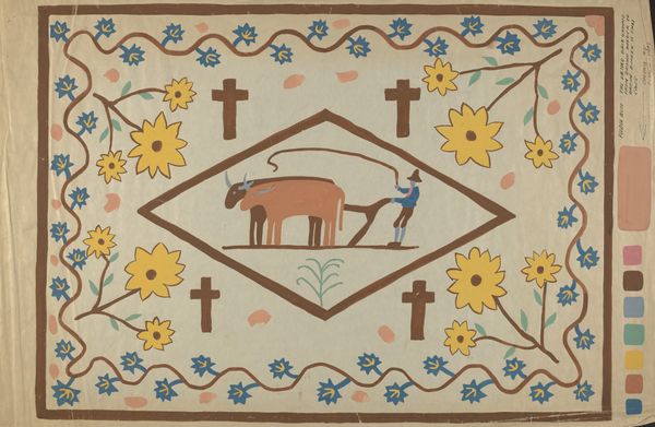 Majel G. Claflin made this 'Colcha' painting, but we don't know exactly when, or where. It’s giving me ideas about how process shapes the final artwork. The painting is all about the materiality of colour and surface. Claflin uses a limited palette: brown, blue, yellow, pink and cream and she applies the paint flatly, with no attempt to blend or create subtle gradations, so each colour stands out distinctly. There is a brown border. Look closely at the marks; the edges are a bit uneven, revealing the hand of the artist. This lack of perfection gives the work a kind of charm, almost like folk art or outsider art. I keep returning to the cross – so directly rendered in brown. It makes me think about faith and how it can be both a comfort and a burden, a symbol of hope and a reminder of suffering. Thinking of other artists doing similar things, maybe Agnes Martin, who explored similar themes of spirituality and simplicity in her minimalist grids. Ultimately, this work is open to interpretation. It’s like Claflin is inviting us to bring our own experiences and beliefs to the table.