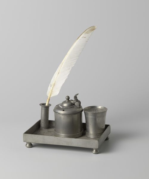 Curator: So, here we have an object identified as a spice grinder, dating from about 1700 to 1750. It combines materials such as bronze, metal, and wood and reflects the Baroque style. What are your first impressions? Editor: Gilded, precise, yet wonderfully absurd. Like something a very small giant might use. There's a strange opulence in miniaturization here. It feels… excessive in the best way? Curator: Excess certainly seems fitting for the Baroque. I'm interested in that tension you pick up on – the juxtaposition of refinement and function. Looking closer, it seems the handle might be made of ivory. Consider the implications of using such a precious material for everyday utility. Editor: Exactly! And that little handle just begs to be turned, you know? I can almost hear the grinding, smell the cinnamon or nutmeg...it is a sensual little beast! And notice how light plays off those rippled edges of the bowl. Beautiful. What would spices have meant to people back then? Curator: Spices were extraordinarily valuable, traded across vast distances. Their fragrance evoked faraway lands; possessing them signaled wealth and global awareness. It would have been both status symbol and potent reminder of worldly knowledge. It connects the owner to something far bigger. Editor: Makes you appreciate that crank and tiny drawers all the more, right? Imagine the hands that carefully turned the spices inside – the hushed secrets, family recipes, herbal remedies created in those precious moments! Is this an insight into their personal culinary landscape? Curator: Absolutely. Everyday objects reveal stories, especially those adorned with symbolism. What stories do you think are told here? Perhaps it hints at trade, access to faraway lands and materials. The engravings upon the wood? They appear idyllic – flora, fauna, almost a paradisiacal impression… Editor: Yes! Reminds me that flavor carries memory, nostalgia... that warm place of home. A mundane task becomes a ritual, an intimate dance… It is no ordinary kitchen gadget but a poem made functional. I am wondering what poem it is meant to convey. Curator: Yes, ultimately it's not merely the object but the connection. As we have seen with just this simple spice grinder. The weight of cultural significance can make the everyday sublime. Editor: Indeed. Just goes to show, beauty, story, connection… can all start with something as simple as grinding spices. A beautiful, unexpected experience with flavor!