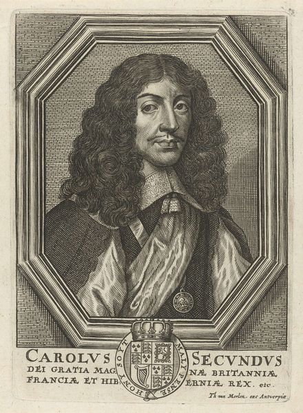 Curator: Here we have Pieter van Schuppen's 1699 engraving, "Portret van de Franse schrijver Honoré D'Urfé," a striking portrayal held within the Rijksmuseum collection. Editor: What hits me immediately is the man's face—a little fox-like, wouldn't you say? Sharp eyes, a hint of amusement playing around the lips… It’s a face made for stories, for intrigues, perhaps even for a little mischief. Curator: Van Schuppen certainly captured a sense of character. Look at the elaborate details, particularly in the lace collar and the cascading curls. The precision of the engraving brings a tactile quality to the fabric and hair. Editor: Absolutely! The oval frame gives the portrait an intimate, almost jewel-like quality. It's like peeking into a secret world. Plus, below the portrait itself, that little heraldic shield adds an interesting layer. Curator: It speaks to Honoré D'Urfé's noble lineage. These emblems served as visual reminders of family history and status. Think of them as an early form of branding. Editor: Branding! I love that. It's fascinating how we still use these kinds of symbols today to convey similar ideas. Though nowadays we might just use Instagram filters, then a meticulously crafted coat of arms to suggest old money and power. Curator: Exactly! And you can see that level of care echoed in Van Schuppen's technique. The way he manipulates light and shadow creates a palpable sense of depth and volume. Intaglio printing has that certain air that stands out through centuries. Editor: It is impressive, like a captured breath from a past century. Looking at this portrait reminds me how powerful visual storytelling has always been in shaping our perceptions of people and history. Curator: Indeed, this image, etched in ink, offers a fleeting connection across time, a silent conversation between us and the era that birthed it. Editor: A beautifully concise thought!