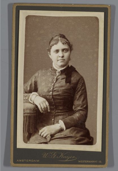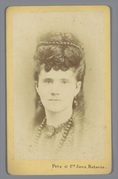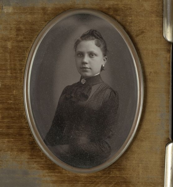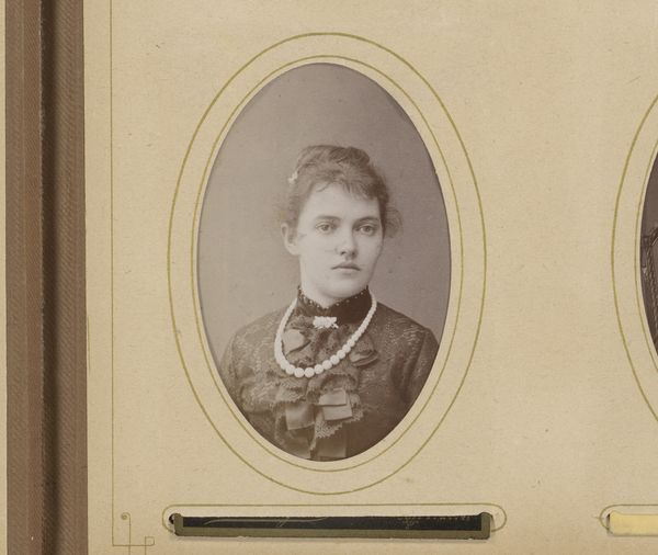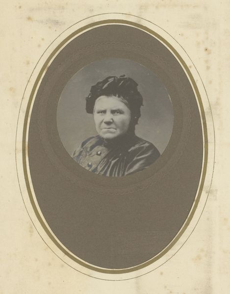 Curator: Looking at this photograph, I feel immediately drawn in by its somber beauty. It evokes a sense of melancholy and quiet strength. Editor: Indeed. This is “Portret van een vrouw,” by Paul Joseph Nicolas Nestor Schaffers, created sometime between 1875 and 1896. The photograph’s presentation—that oval frame, the material used—gives the portrait a specific, almost handmade, quality. I’d argue that the framing is almost as integral to the final image as the subject. Curator: Absolutely. The sitter's reserved pose and simple attire invite us to contemplate the role of women in that era and their limited access to self-expression. The historical context is palpable, highlighting the intersection of gender and societal expectations. I am especially drawn to the subtle ways in which she asserts agency despite these limitations. Look closely, you can almost see a hint of defiance in her expression. Editor: It is fascinating how the choice of photographic medium speaks to wider socio-economic dynamics too. Was photography accessible to many people during that period? The material process suggests deliberate commissioning. Considering the level of work involved, the time needed, this isn’t just a snapshot. Think about who she might be, how much that portrait would cost her family at the time. This makes it clear it was only possible for women in a very limited class. Curator: Precisely. It begs the question: who was she, and what stories did she carry? This image makes me want to unpack not only the aesthetics, but also the economic realities that enabled her representation, making her visible, and embedding her narrative into a visual culture largely dominated by men. Editor: Her very appearance—the dress, the hair—speaks volumes. The subtle details of its construction and the fabrics used surely indicate class, perhaps aspirations. This links directly into the historical framework—the industrial labor practices producing those goods, the networks of trade… all material forces at play in that image. Curator: It serves as a powerful reminder of the intertwined layers of history, identity, and representation—offering a window into a complex social tapestry. Editor: I agree. It’s interesting to trace it back and see all of that layered into one simple, seemingly straightforward, image.