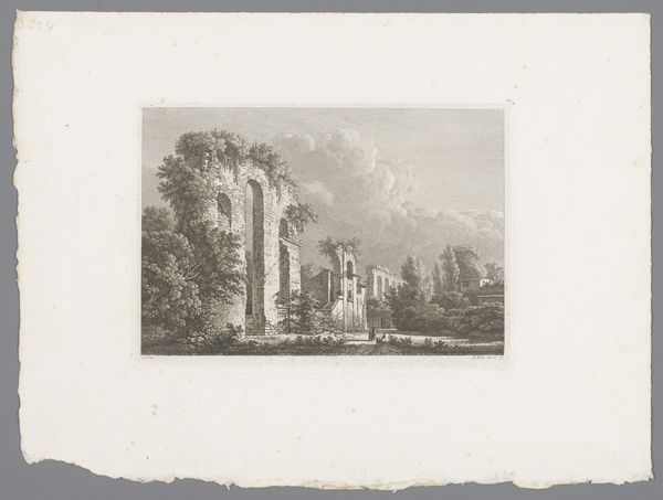Curator: Paulus Lauters created this engraving on paper titled "Gezicht op Kasteel Batenburg," sometime between 1827 and 1875. It resides here at the Rijksmuseum. Editor: The ruined castle immediately conveys a sense of romantic melancholy. The composition is balanced, but there’s a subtle diagonal created by the way the landscape leads the eye from left to right, culminating in the tallest part of the ruin. Curator: Absolutely. The castle ruin itself carries potent symbolism. Ruined structures frequently represent the passage of time and the impermanence of human achievements. Batenburg Castle specifically experienced multiple sieges and was eventually left to decay. Editor: It's fascinating how the artist used light and shadow. There is a softness to the overall image. See how the varying gray tones create depth and atmosphere. The artist uses techniques similar to that of aquatint but in engraving. It’s less about precise detail and more about overall tonal effect. Curator: True, though Lauters’ work also reveals an interest in historical narrative. Picturesque ruins of castles often served as symbols of national identity, especially in the Romantic era, suggesting the nobility of the past while also gesturing toward political changes in 19th-century Europe. Editor: What I also notice is the detail in the architecture – that the bridge connecting different parts of the ruin gives access between what exists of that ruin; very elegant with how the image as a whole carries that bridge between reality and memory, I would say. Curator: Considering Lauters' broader body of work, he does seem to have consistently engaged with images that evoke these notions of national pride intertwined with the stark realities of history, with echoes of former glories fading into present decay. It's a recurring motif. Editor: Agreed. It really underlines the complexities of nostalgia. By the way the buildings connect I feel the desire for people to still access it even today. A potent visual statement using the simple formal elements.
