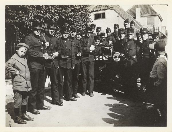 This photograph, titled "Matrozen in Parijs," captures a group of sailors in Paris, and although the artist is unknown, the image offers a glimpse into a specific moment in time. Given the setting, we might consider the historical context of naval presence in European cities. What does it mean to see these uniformed men in a place like Paris? The sailors' collective identity is crucial. They represent a nation, a service, and perhaps a particular set of ideals or policies. The anonymity of the photographer, coupled with the lack of specific date, invites us to project our own understanding of history onto the image. The expressions on the faces of the sailors are hard to read, leaving us to wonder about their individual stories and emotions in this moment away from home. This photograph serves as a reminder that behind every uniform and every historical event, there are individual experiences and emotions that shape our understanding of the past.
