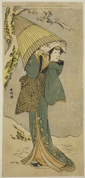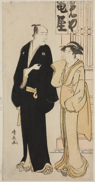 Curator: Right, let’s have a closer look at this arresting image. This is a woodblock print by Torii Kiyonaga, made around 1783. It’s part of an untitled series depicting actors in private life and this one features the actor Matsumoto Koshiro IV with a geisha. The piece is held here at the Art Institute of Chicago. Editor: My first thought? Intense. Look at the contrast in those robes—almost dizzying—but also, there's this undeniable tension between the figures. The geisha looks like she’s trying to placate someone, perhaps him? There's something brewing under the surface. Curator: You've keyed into an interesting dynamic. Kiyonaga was working in a period where prints were becoming increasingly focused on capturing realistic portrayals of contemporary life in the floating world, the world of the pleasure districts. What makes this particular print interesting is the glimpse into the lives of these public figures off-stage, outside of the theater. The actor, of course, held a great deal of social and cultural cache. Editor: Absolutely, and it makes you wonder, what’s their relationship really like? I imagine it's pretty stylized as any "candid" scene featuring a celeb. Does it reflect the artist’s biases? Or the commissioner's for that matter? Curator: The actor print genre really helped construct public perceptions and ideals of these personalities. In this instance, what does it say about the commodification of both artistic and performative genius in this specific Ukiyo-e context? Kiyonaga’s use of elegant, elongated figures adds a real layer of grace. It highlights how carefully constructed even these supposedly 'private' moments actually are. Editor: Absolutely, the elongated figures remind me of an El Greco painting somehow, albeit filtered through the lens of a culture quite apart. It also strikes me, in the details, there's a beautiful starkness against all the grandeur, like bare winter branches providing the backdrop to all this. It whispers a seasonal metaphor of its own, a fleeting ephemeral reality of success. Curator: Well, to sum it up, what Kiyonaga's given us isn’t just a pretty picture; it's a snapshot of a carefully curated world, ripe with implications about celebrity, gender, and social hierarchy in late 18th-century Japan. Editor: Yes. I keep circling back to that tension, though. Makes the print endlessly fascinating. Almost makes me want to know what that Geisha is thinking. Maybe I will pen a small fanfiction for them in my notebook!