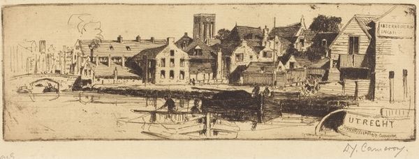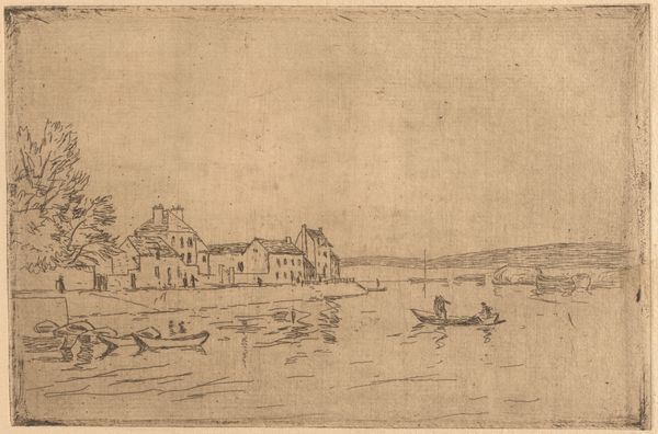 Curator: Joseph S. Jablonski's etching, "Rockport, Massachusetts," captures a quiet coastal scene. I'm struck by how serene it appears. Editor: Indeed, there's a stillness. Notice how the linear precision in the buildings contrasts with the blurred, almost dreamlike quality of the water. Curator: The church steeple anchors the composition, drawing the eye upward. Churches, historically, served as both spiritual and civic focal points, suggesting community and shared values. Editor: And the boats, rendered with such delicate lines, offer a rhythm to the lower third of the piece. One empty, creating a sense of anticipation or even abandonment. Curator: Precisely. The absence can symbolize many things: the transient nature of life, the call of the sea, or the simple passage of time. Editor: I appreciate the artist's control over the etching process. The fine lines create such depth and texture within a limited tonal range. Curator: It's a peaceful reminder of simpler times. Editor: A moment suspended, beautifully rendered.