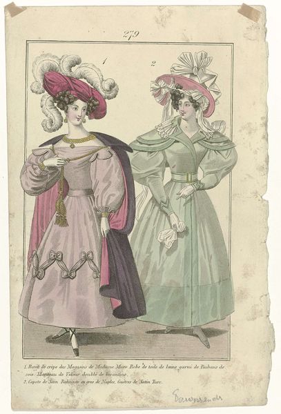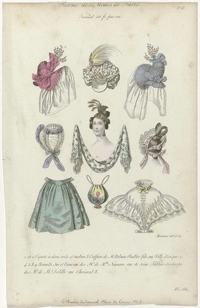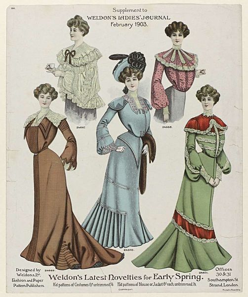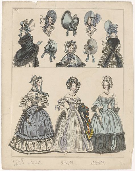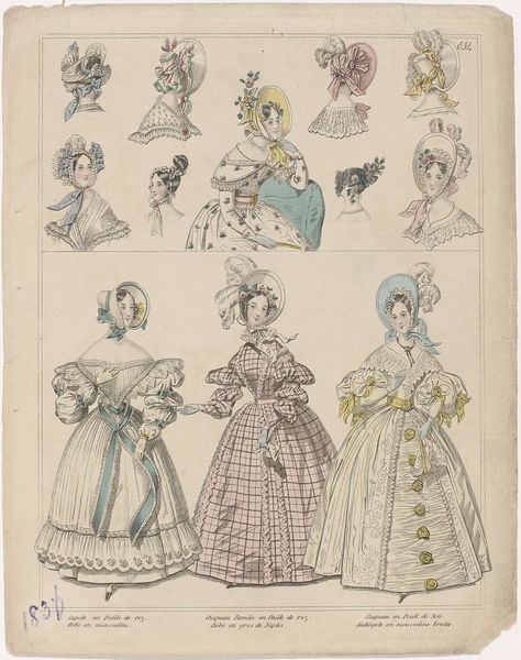 This is an anonymous fashion plate titled "Townsend's Monthly Selection of Parisian Costumes, ca. 1834". It was created around 1834, and it presents an assortment of women's fashion from the period. During this time, fashion plates like these played a crucial role in dictating trends across Europe and America, especially among the upper classes. The image showcases not just clothing, but an entire aesthetic identity. We see elaborate dresses with puffed sleeves, ornate hats, and carefully styled hair – all markers of status and femininity. What does it mean to perform these highly gendered roles? Consider the immense time, labor, and resources required to maintain such an image. These women were essentially walking billboards of wealth and leisure. The fashion plate is less about individual expression and more about conforming to an ideal. While seemingly frivolous, fashion served as a powerful signifier, reinforcing societal hierarchies, and reflecting the aspirations and constraints placed on women in the 19th century.