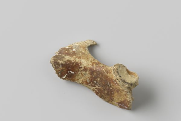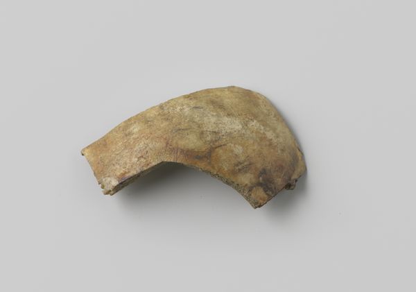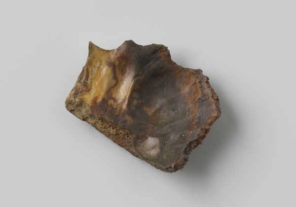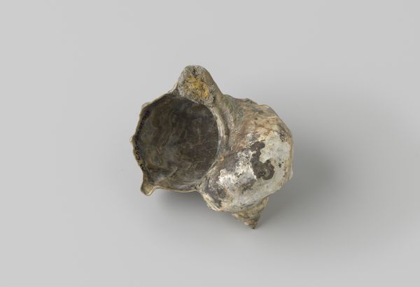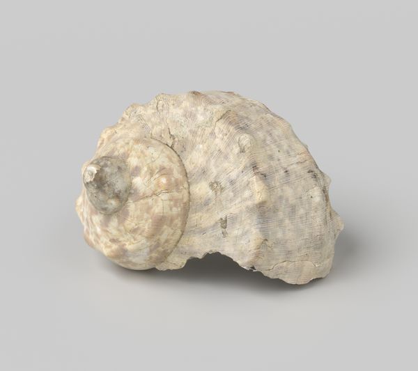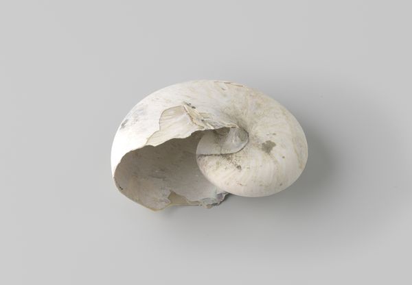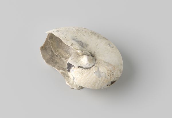 Curator: Looking at this nautilus pompilius shell, recovered from the wreck of the Witte Leeuw, a Dutch East India ship that sank before 1613, what strikes you? Editor: An eerie calm. It's almost as if the ocean's secrets are whispering from the curves. I'm fascinated by the damage it's weathered, the stories held within each imperfection. Curator: Indeed. Beyond its aesthetic appeal, consider the social context of its creation. The Dutch East India Company used items like this for trade. The labor of obtaining these shells and the circumstances of its loss due to shipwreck highlights colonial economic activity. Editor: I get the history lesson, but to me, it feels deeply personal, more a reflection on mortality than capital. Holding it, one could imagine entire worlds inside its spiral – each chamber, a forgotten memory. A sunken echo of an old ambition. Curator: It's interesting you frame it that way. While the shell embodies natural artistry, the wreck also raises questions of Dutch maritime trade networks and the risks workers faced procuring luxury items like this for the market. Its value transcended mere decoration. Editor: Absolutely, but beauty transcends economics, don't you think? Despite the tragic loss, or maybe because of it, the shell has morphed into something more. Its rough, aged texture provides a profound textural narrative about resilience and time. Curator: Agreed. Perhaps examining this particular nautilus transcends strict categorization. It bridges art and artefact; found object and sculpture. Ultimately its cultural biography helps illuminate early trade in luxury commodities. Editor: So, both a relic and a messenger. I love that. Looking at it again now, knowing that… it feels like the ocean's own poignant poem.