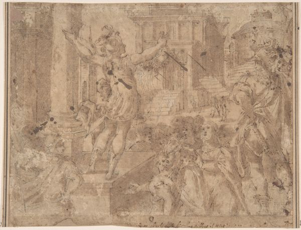 This drawing, by Alessandro Allori, was made with pen and brown ink, heightened with white, on brown washed paper. It depicts a victorious general receiving defeated opponents. The choice of materials here isn't accidental; the brown wash gives the work a sense of classical gravitas, like an ancient artifact unearthed. Allori used a quill pen to create the intricate details of the figures, clothing, and architectural elements, allowing for fine lines and subtle gradations of tone. The addition of white heightening adds highlights and volume, enhancing the drama of the scene. This mode of drawing was common in Allori’s time, a technique used to create preparatory studies for larger paintings or frescoes. It allowed artists to explore composition, lighting, and figure arrangements before committing to the final work. In the process, Allori’s drawing transcends its function as a mere study; it becomes a work of art in its own right.