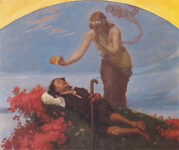 Editor: This is Odilon Redon's "Saint Sebastian," a pastel from 1910. The colors are so soft, but the image is undeniably painful and melancholic. How do you interpret this work, with its rather muted tones for such a violent subject? Curator: Indeed, Redon departs from the typically graphic depictions of Saint Sebastian’s martyrdom. It's interesting how he uses the symbol of the wounded figure almost as a landscape element, fusing the suffering with the setting. The arrows, the binding – these are loaded with symbolic meaning, not just of Christian martyrdom, but perhaps more personally for Redon, a sense of inner torment. Notice the field of flowers at the base; do you think those hold any specific significance? Editor: Perhaps a contrast? Life blooming even in the face of death. The vibrant flowers against the stark reality of Saint Sebastian’s suffering creates a striking dissonance. Curator: Precisely. It reminds us that symbols aren't static; they're constantly being re-interpreted. Redon layers these images – religious iconography, natural beauty, human pain – to create something intensely psychological. We project our own experiences, anxieties, even our own hopes for transcendence, onto the image. Consider the lone tree, almost embracing the figure. What does that pairing suggest to you? Editor: I see a sort of protection, a sheltering from the storm of suffering. It's thought-provoking how Redon uses familiar imagery to convey something deeply personal and universal. Curator: Exactly. It showcases the beauty and burden that symbolic representation provides, speaking volumes beyond mere illustration.