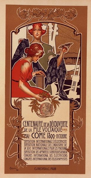 Curator: Let's delve into Maurice Denis's poster from 1898, “La Dépêche de Toulouse,” an intriguing example of Art Nouveau promotional print work. Editor: It’s immediately striking! The colors are so warm and inviting—that lovely terracotta and olive. There's a feeling of ascension, maybe hope? And yet, it has a subtle melancholy to it. Curator: Absolutely. We must remember the charged social context. Denis, deeply influenced by Symbolism, crafted this during the Dreyfus Affair, and La Dépêche de Toulouse was a prominent voice defending Dreyfus. So, that figure in the flowered dress isn’t just an aesthetic choice; she becomes symbolic of justice, of truth emerging to the public gaze. Editor: Ah, yes! That draped figure does appear like a classical goddess. She's surrounded by symbols—those floral motifs likely chosen not just for aesthetics, but perhaps suggesting themes of renewal or enlightenment blossoming amidst societal tension? And the eyes all staring up to the newspaper feels religious somehow. Curator: Indeed! We should understand her placement in line with depictions of secular annunciations prevalent around the fin de siècle. Also, this composition emphasizes the communal receiving of knowledge. Observe how those arms reaching upward become part of a visual movement aimed toward access and information as emancipation. Editor: This perspective radically changes how I viewed the upward movement of people, elevating "La Depeche" to almost deity-like significance for truth, knowledge, and deliverance during very uncertain political times. Curator: Considering Maurice Denis's role within Les Nabis and their influence on integrating art into everyday life, what we have here isn’t simply decoration or even information—it's a call for societal reflection. Editor: Exactly! He brilliantly wove layers of meaning within seemingly straightforward design. It becomes less about a single promotional idea, and more about communal upliftment and potential hope that stems from knowledge. Curator: Yes. What originally seems like an everyday advertisement encapsulates layers that invite profound reflection around media representation and popular consciousness at the time. Editor: Well, I’ll certainly be re-examining how newspapers themselves could be visualized as symbols of profound significance in social movements from here on!