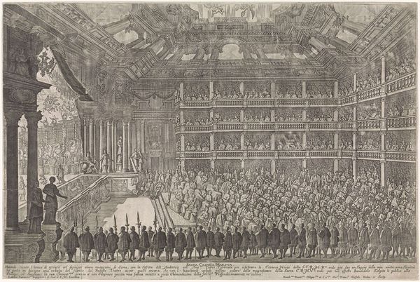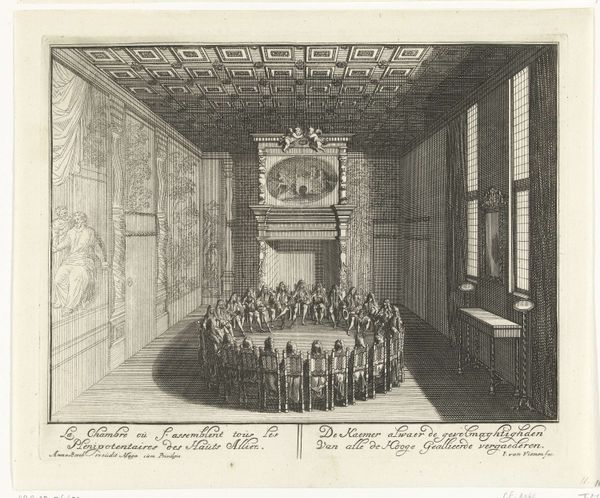 Editor: So, this print is titled "Chinese King and his Bodyguard," made around 1710. It's anonymous, so we don't know who created it. It looks like an engraving, with really fine lines. It feels very formal, almost staged. I’m curious about all of these characters; what's the story? What can you tell me about it? Art Historian: Well, as a historian, I see this not just as an image, but as a document of cultural exchange and power dynamics. The very act of creating and circulating this print tells us something about Europe's fascination with and, perhaps, its aspirations toward China at the time. Editor: Aspirations? What do you mean? Art Historian: Europe at the time viewed China through both a lens of admiration and competition. Prints like these served as a form of visual consumption. By depicting the Chinese court in such a rigid, organized manner, how do you think it shapes the viewer's perception? Is it meant to showcase wealth, or project order and power? Editor: I guess it emphasizes their power. All those rows of people... It makes the King seem so important, the center of everything. Art Historian: Exactly. The composition, the line work, even the text included below the image – all were chosen for a specific audience. It invites questions about representation itself: who gets to tell whose story, and what is the power they are enacting in the telling. Do we see real life, or performance? Editor: That's a point of view I would never have come to on my own! I was only really focused on the look, on what was represented. It is helpful to remember that it always depends on the when, and the who of art and culture. Art Historian: Precisely. We looked and found there is much more than an orderly staging of people - even in simple strokes there is culture!