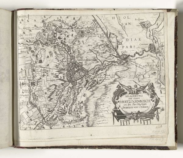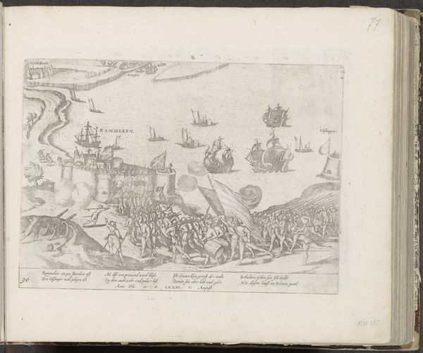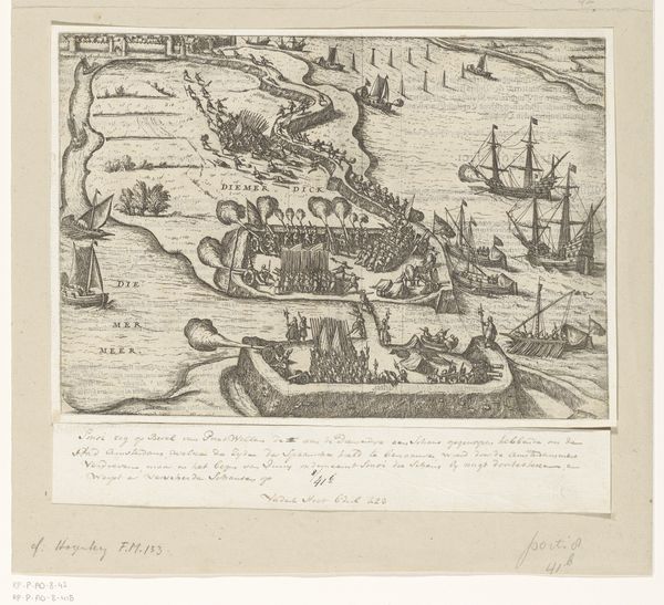 Curator: Here we have "Inname van Larache in Marokko door de Spanjaarden, 1610" by Frans Hogenberg. This piece, created between 1610 and 1612, captures the Spanish capture of Larache, Morocco, using drawing and engraving techniques. It's currently held in the Rijksmuseum's collection. Editor: My initial impression is one of intense detail and spatial awareness, all rendered in this monochromatic medium. You can see the deployment of resources; ships massing in the harbor contrasted against the fortress, seemingly impregnable in the top right. It feels almost like a meticulously constructed diorama. Curator: Exactly. Hogenberg’s use of printmaking is fascinating here. The etching, the drawing – these were reproducible, easily disseminated. So the fall of Larache ceases to be just an isolated military event, but becomes a circulated piece of political imagery, contributing to Spain's self-representation. Consider how a piece like this helped cement Spanish power through the literal multiplication of its image. Editor: It strikes me too, how the very process – the making of the print itself – reflects the act it depicts: a taking. Larache is rendered into copper or wood, subjugated to the artist's vision, the printing press and the consumption by whoever views it after the press. The material is instrumental in the act of dominion. Curator: Indeed. The map format itself reinforces this. These weren't just pretty pictures; they informed strategic decisions, justified colonial ventures. Notice the heraldic crest at the upper right; that would be immediately recognizable as reinforcing whose power structure benefits from the conflict at hand. Editor: It begs the question, who was the intended audience for this? How was it distributed, and how did that distribution contribute to a sense of shared identity or national project? Was it part of larger atlases sold widely to a growing educated public, and used by officials and interested people who craved news and historical factoids? It raises interesting considerations about access and consumption. Curator: Ultimately, this engraving presents a complex interplay between artistic skill, material production, and the social and political forces that shaped early 17th century Europe and its relationship with North Africa. Editor: A seemingly simple image, it truly unearths multiple layers. We started with its immediate impression, dived into its implications of the historical moment, and understood a little more about that time.