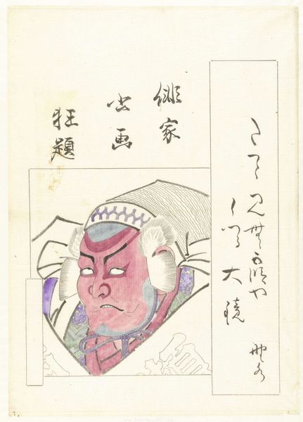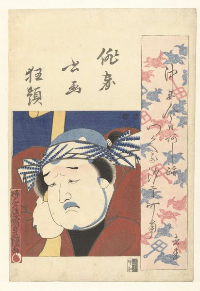 Editor: This woodblock print from 1847-1848, titled "Busteportret van een acteur" and created by Utagawa Kunisada, depicts a theatrical actor in a stylized portrait. There's an intensity in his face; the artist has amplified his features, lending a somewhat unsettling yet compelling presence to the piece. How do you interpret this work based on its formal qualities? Curator: Focusing on the composition, the artist utilizes a bust format, which immediately centers attention on the actor's face, enhancing its expressive capabilities. The application of color is quite striking; note the contrasted pink and blue on the face. This highlights specific regions while simultaneously flattening the overall picture plane, pushing against the conventions of realistic representation. Editor: It almost feels like the coloring amplifies the drama inherent in the caricature itself. Curator: Precisely. Furthermore, observe the intricate linear work used to delineate details in the actor’s hair and clothing. These carefully orchestrated lines interact with larger blocks of color. In regard to structure, can you speak to your interpretation of how line directs our reading? Editor: Well, the bold lines create definition and hierarchy in the image. The calligraphy juxtaposes, through varied rhythm, with the linear definition used to render the bust. Curator: Indeed. In this piece, we find that a commitment to a cohesive structure enables this composition to cohere despite divergent modalities of presentation. This work invites us to explore the complex formal relationships enacted through surface and symbol. Editor: I hadn't considered how the print’s structured surface affects its presence, this lens challenges a singular impression, highlighting formal execution instead. Curator: Exploring visual elements as primary communicators shifts our perception, offering multiple viewpoints for understanding the artist’s intentionality.