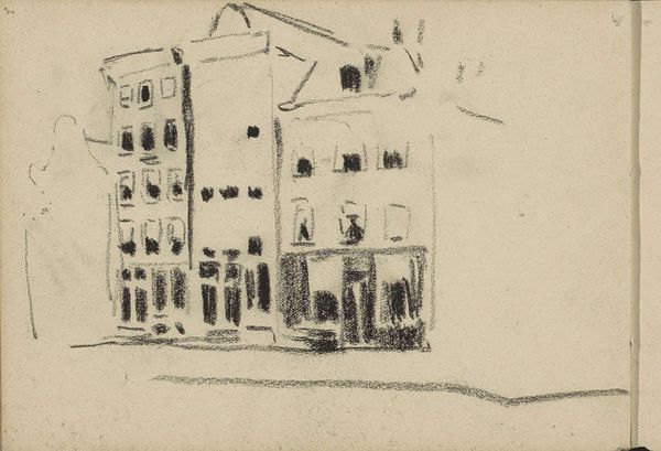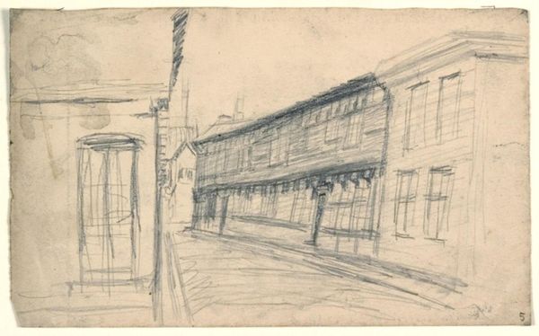 Curator: Today we’re looking at Keith Allen Crown's "The Strand (center panel)," a 1948 print crafted with graphite. Editor: Oh, immediately I’m feeling a sense of stagecraft, almost theatrical. The buildings are these looming facades, lit starkly from…somewhere. Is it dawn? Or something more sinister? Curator: It's interesting you pick up on that stage-like quality. These somewhat crude structures echo classical facades and invite thoughts about impermanence. Consider the material. The softness of the graphite lends a dreamlike vulnerability. It almost feels like a fleeting memory, doesn't it? Editor: Absolutely. And that's contrasted so interestingly by the sharpness of the angles of the buildings, the lines of the sidewalk...It is like trying to grasp a fading moment, attempting to box up an ethereal impression into concrete shapes, with only moderate success. Look, those darks are quite powerful, making me feel like someone’s playing hide and seek. Curator: That potent contrast definitely heightens the tension, doesn’t it? There's also a noticeable absence, isn’t there? We see two figures at left, but everything suggests absence and the looming darks suggests existential dread and postwar anxiety. The image reminds me of alienation in modern urban spaces. Editor: Alienation—yes! They appear separate from the architecture. Perhaps they have also been thrust onto the stage against their wills? Trapped in this drama...but playing an oblivious duet together while Rome is burning nearby... Curator: A loaded reading! But what else could the artist imply with the location? And the figures themselves suggest an entire drama! They underscore the overarching theme and suggest an internal world clashing with the one the artist sees every day... Editor: Right. It makes you wonder about the artist's state of mind. If this "Strand" has that quality, what lurks elsewhere in Crown's oeuvre? Curator: Indeed. So much history, cultural anxiety, and personal expression folded into one haunting graphite drawing! It is just marvelous.