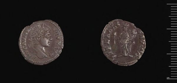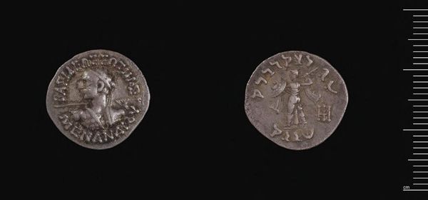 Curator: Here we have a Drachm of Menander I Soter of Baktria, a silver coin currently held in the Harvard Art Museums collection. Editor: It's like holding history in your hand, isn’t it? It looks so worn, it has that well-travelled feel, like a pebble smoothed by the sea. Curator: The coin's design is quite striking, isn't it? We see the bust of Menander on one side, regal in his diadem, with Athena Alkidemos depicted on the reverse, holding a shield and thunderbolt. Editor: Athena with a lightning bolt! Sounds about right for a ruler trying to make a statement. I wonder what stories it could tell if it could talk. Curator: Precisely. The symbology used is fascinating. It speaks volumes about Menander's Hellenistic identity and the cultural exchange happening in the region at the time. Editor: It's almost humbling, thinking about the touch of human hands across the ages. It makes me wonder about all the things we deem valuable now, and what will survive of us. Curator: A poignant question indeed. I appreciate how this small coin encapsulates complex ideas of power, identity, and cultural fusion. Editor: Totally. And from an object that could probably fit on my thumbnail! It's the best kind of art really, isn't it? Making us think differently.