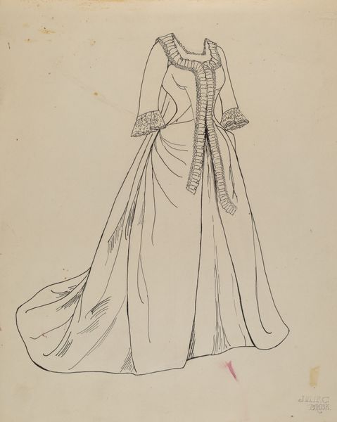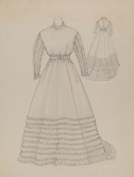 Edith Magnette's "Dress" is a graphite meditation on paper that feels like a whisper from another era. Look at how the dress emerges through delicate lines and intricate patterns, a testament to the process of seeing and rendering. It's as though Magnette is inviting us to consider the unseen labour behind fashion. The texture is smooth, almost ethereal, mimicking the delicate fabric it represents. The graphite is applied with such precision in the decorative elements, and the lines of the main panels are allowed to stand alone. It's a ghost of a garment, really, and I wonder what it feels like to wear nothing? The restraint in detail and tone makes me think of Agnes Martin's careful pencil grids, each line a testament to the artist's focused attention. This piece invites us to appreciate the beauty in simplicity and the power of suggestion, reflecting how art embraces ambiguity and multiple interpretations.