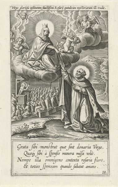 Curator: I find this 1611 engraving, "Miracle of the Rain Shower" by Theodoor Galle, fascinating. It's a story captured in lines. Editor: My initial feeling? Stark contrasts. That intense downpour, almost like vertical bars, versus the figures bathed in light. It feels dramatic, certainly. Curator: Absolutely. Galle's skill lies in constructing narrative. Look how the community—presumably saved by Saint Dominic—clings to him. It emphasizes the Church as protector in a turbulent era. It’s more than faith. It’s community survival, depicted through devotion. Editor: The halos almost solidify that sense, yes, but look at the background as well. That village. It represents more than safety, though—that bright, halo-like glow on the individual walking beside him feels psychologically reassuring; not just divine but intimately calming in an earthly way. It grounds us in how faith eases individual and communal anxieties during periods of societal change and external hardships. Curator: The imagery certainly reflects the political climate as well as societal unrest of the time. The early 17th century saw considerable political instability across Europe, Galle presents Saint Dominic as an emblem of stability amid chaos. Print became crucial media and tool through such tumultuous changes. Religious figures represented tangible connections, visible proofs against chaos and anxiety Editor: Do you think that's why the crowd has no unique facial expressions to tell them apart as individuals but instead seem more symbolic, unified under robes—so we’re clearly driven to interpret this event and Saint Dominic himself as representative and universal concepts? Not merely individuals within an isolated incident. Curator: Exactly! These depictions reinforced the idea of a shared identity—faith, salvation and protection through devotion—effectively mobilizing the population in favor of the Church's power. And the choice of line engraving allowed for wide distribution; political and cultural propaganda into every home. Editor: So, by visually anchoring salvation and societal harmony to such a striking act of holy intervention, Galle subtly bolstered social power? Amazing. Curator: That's the historian in me! The artwork itself can tell stories of how institutions negotiate their power during transformative periods, how symbols take new weight under historical circumstances, especially considering Galle worked under the Plantin-Moretus printing press whose network had considerable reach during his time Editor: It's remarkable how a seemingly simple print can be unpacked layer by layer. Gives so much significance to an object that could otherwise be easily glossed over.