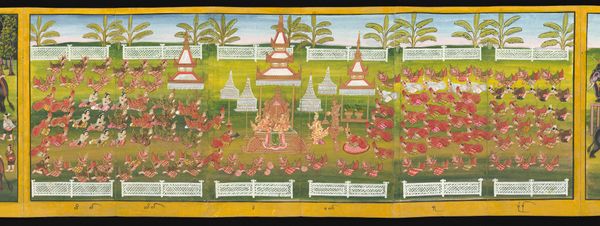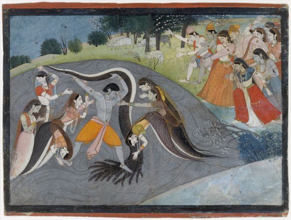 Curator: This is a page from a dispersed Gita Govinda series, "Krishna and Radha in a Bower," painted between 1655 and 1675, likely by Sahibdin. It’s a miniature watercolor housed at the Met. Editor: The colours are so vibrant. I love how it feels like a secret glimpse into a very lush and private world. What do you see when you look at this work? Curator: For me, it’s a fascinating look at the social and material conditions of artistic production. We often treat these miniatures as purely spiritual or aesthetic objects, but think about the pigments – where did they come from? Who ground them? And what about the paper itself, its manufacture, and trade routes? This was not just an act of devotion, but also skilled labor. Editor: That's really interesting. I'd never considered the economic side of making art like this. Does the depiction of nature here give you any clues? Curator: Absolutely! Sahibdin was working in a specific historical context – the patronage system of the Rajput courts. This idealized, almost stylized landscape reflects not only a concept of beauty, but perhaps also the wealth and control the patrons had over resources, including skilled artisans and materials sourced from distant lands. Editor: So the beautiful scenery isn't just a backdrop but a symbol of power? Curator: Precisely! Consider, too, the labor involved in creating such detail, each brushstroke carefully applied. The scale itself speaks to a specific kind of elite consumption, something to be carefully possessed and viewed intimately. It’s a world away from the mass production we see today. Editor: Wow, that really reframes how I see it. Thanks! Curator: My pleasure! Thinking about art this way really highlights the connections between aesthetics, labour and economic systems.