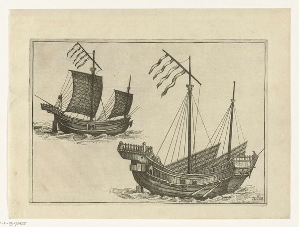 Editor: Here we have "A Herring Buss," an engraving by Meester W met de Sleutel, dating back to around 1490. I’m immediately drawn to the ship’s sturdy, almost fortress-like quality as it navigates what looks like some pretty turbulent waters. How do you interpret this work, particularly given its historical context? Curator: It's fascinating, isn't it? Think about what the herring buss represents in the late 15th century. It’s not just a fishing vessel; it’s a symbol of economic power, of the rise of merchant classes and early capitalism, particularly in the Low Countries. How does this image challenge or reinforce contemporary perceptions about labor or colonialism? Editor: So, this isn’t just about fishing. It’s tied to larger historical power structures. Are those barrels on the ship part of that story, related to trade? Curator: Precisely. They are critical components that allowed processing and storage at sea. Who exactly does that benefit, and who may not profit? Consider how advancements like the herring buss, enabled certain social classes to accrue capital and power. Does the print aesthetic change your perception of labor? Editor: That makes me think about the fishing industry even today, about sustainable fishing and labor exploitation in global trade. So, by showcasing the buss, is the artist also, perhaps unintentionally, revealing emerging socio-economic divides? Curator: Exactly. The image becomes a complex commentary on emerging social stratification and exploitation in that era. It encourages a reflection on continuities with modern social issues, urging you to examine who benefits from resource extraction and how visual culture often subtly obscures that cost. What has changed from 1490 till today? Editor: Wow, I never would have thought that a seemingly straightforward image of a ship could open up such a layered discussion about economic and social dynamics. Thank you! Curator: The power of art lies precisely there, in revealing hidden dimensions. The challenge now lies in examining how the artwork makes one re-evaluate what one already knows about history.
