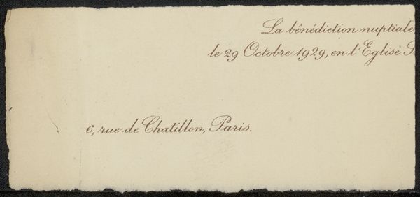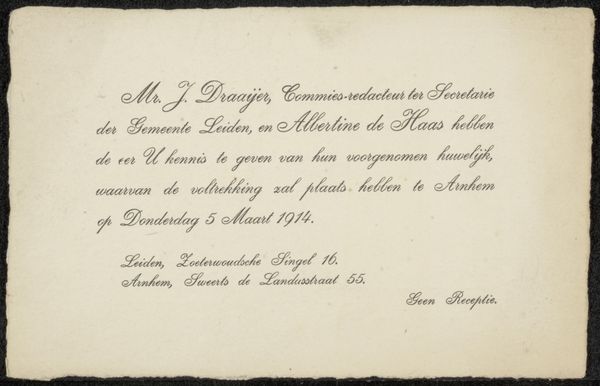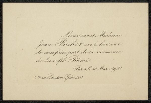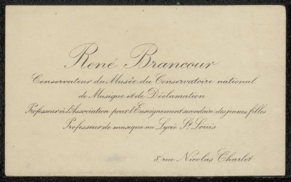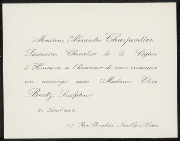 Curator: We are looking at “Uitnodiging aan Philip Zilcken,” a piece dating from 1867 to 1902 by Marie-Laetitia Bonaparte-Wyse. It's an invitation crafted with ink on paper, showcasing her talent for calligraphy. Editor: Oh, how wonderfully vintage! I adore the elegance of the script. It’s so restrained and refined—makes me think of hushed drawing rooms and furtive glances over steaming teacups. Curator: Indeed. It's important to note the context of this invitation. Marie-Laetitia, using her connections within Parisian literary circles, fostered these kinds of gatherings, subtly wielding influence. The invitation isn't just an invitation; it's a power play disguised as hospitality. Editor: Power play? Well, I prefer to think of it as sophisticated networking! All that beautifully looping text hides a little barb for sure, or perhaps some strategically positioned literary bombs set to explode over coffee and petit fours. Curator: Precisely! The “Nouvelle Revue Internationale,” mentioned prominently, was at the heart of intellectual discourse, and controlling the guest list meant shaping that discourse. The casual mention of the weekly dinners for "rédacteurs et collaborateurs" at 23, Boulevard Poissonnière underscores the Revue's significance in Parisien cultural life. Editor: Boulevard Poissonnière. Even the address drips with sophistication! But focusing back on the lettering—it’s exquisite, though slightly... menacing, almost daring you to RSVP no, dare you be absent! Curator: The calligraphic style aligns with the era’s emphasis on formality and grace. However, these forms, though ornamental, could also enforce social hierarchy. By dictating who was "in," they inevitably marked who was out. Editor: Hmmm...it also seems that, through the craft of invitation, Wyse is revealing to us that all that appears as refinement, as style, and good taste can be a mechanism of exclusion. What do you think Zilcken made of it all? I wonder, did he accept? And if so, was he thrilled or anxious to attend? Curator: I think exploring the nuances of invitation, then and now, opens up broader dialogues about belonging, access, and cultural capital. Editor: And who knew all of that could be captured in ink on paper, slipped silently into an envelope? I feel invited to keep looking.