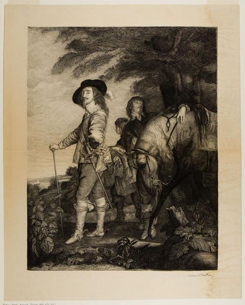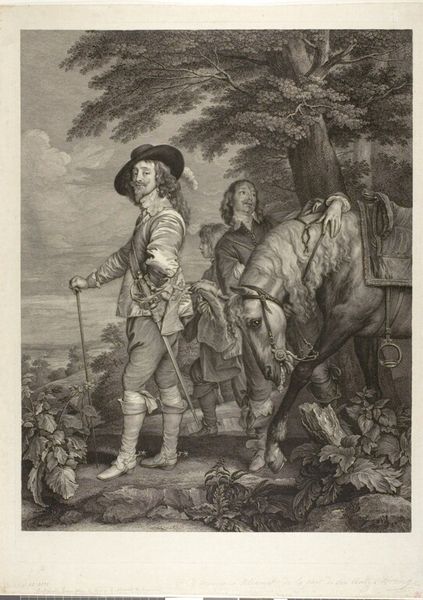 Editor: Here we have James Charles’s “Charles I of England with the Duke of Hamilton.” I’m struck by the composition; the figures seem staged against a backdrop rather than integrated within it. What do you see in the contrast between the subjects and the landscape? Curator: Note the calculated arrangement: the precise posture of Charles, balanced by the Duke's casual stance and the horse's bowed head. The light catches the textures of fabric and fur, creating a visual hierarchy that emphasizes Charles's regal bearing. The landscape functions as a formal element, directing our gaze and reinforcing the subject's authority. Editor: That's a fascinating way to put it. I hadn't considered how deliberately constructed the composition is. Curator: Indeed. This controlled presentation serves to project power and legitimacy. Editor: I'll definitely look more closely at composition from now on.