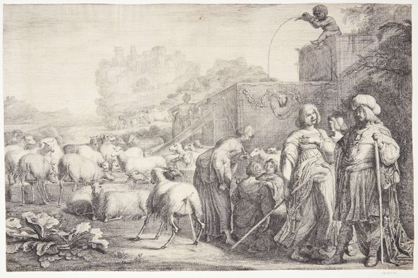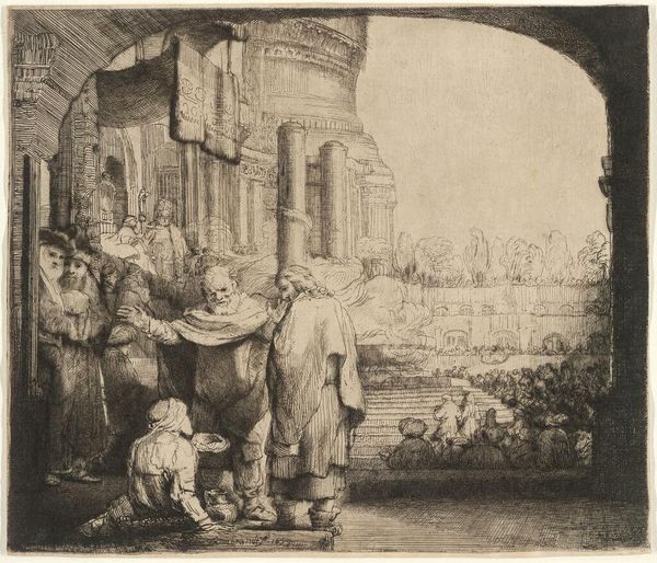 This etching, titled *Peter and John heal a paralyzed man at the temple gate,* presents a scene of divine intervention set against a backdrop of societal exclusion. Created by an anonymous artist, the piece captures a biblical moment, inviting us to consider its historical context and enduring themes of faith, healing, and social disparity. The setting is the temple gate, a place of transition between the sacred and the secular, where the disabled man is relegated to the margins of society. Peter and John’s act of healing isn’t just a miracle; it's a disruption of the social order. It challenges the prevailing attitudes towards disability and poverty. The composition draws us to the emotional core of the event – the hope, the desperation, and the transformative power of compassion. This etching serves as a mirror, reflecting both the timeless human desire for healing and the ongoing struggle for a more inclusive society. The artist prompts us to reflect on how we perceive and treat those who are marginalized.