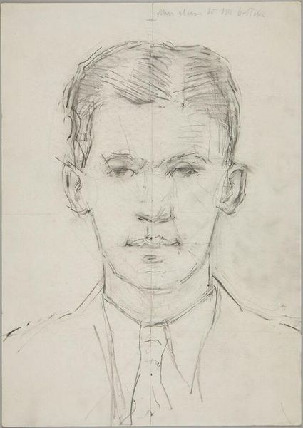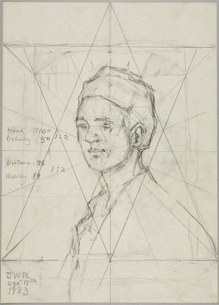 Editor: Here we have Denman Waldo Ross’s "Male Head," a pencil drawing. I’m struck by the underlying geometric structure. How do you interpret this work? Curator: The geometric grid overlaid onto the portrait suggests an engagement with ideal forms and proportions, reminiscent of Renaissance ideas. Do you see how the subject's gaze intersects with the lines, almost as if he is trapped within a symbolic framework? Editor: That's interesting. It almost feels like the artist is trying to find a universal ideal of masculine beauty. Curator: Precisely. The visual vocabulary of geometry acts as a kind of cultural memory, hinting at the enduring quest for perfect form in art. I wonder what Ross sought to convey with this? Editor: It’s fascinating to see how geometry and portraiture can create such an intriguing dialogue. Curator: Indeed, revealing hidden symbolic layers beneath the surface.