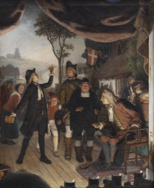 Curator: This delightful piece before us is "Moving Day Scene," a watercolor and gouache work dating back to 1831 by Wilhelm Marstrand. Editor: My immediate reaction is one of organized chaos, really. The composition, despite all the activity, manages to guide the eye efficiently, particularly with that diagonal recession of figures moving towards the left. Curator: Indeed, and beyond its formal qualities, this painting presents a compelling snapshot of 19th-century urban life. Moving days in cities were notorious social disruptions, impacting every level of society. Editor: Notice Marstrand’s strategic use of light? How it gently caresses the faces, giving form, volume and drawing our eyes? He certainly understood tonal modeling and color value and saturation. Curator: Exactly! It's key to understanding the shifting demographics and class dynamics of the time. One sees these class markers subtly embedded within dress, burden carried. The older woman shrouded, and clinging to a relative, shows the societal implications of mobility. Editor: And did you observe how the artist cleverly framed the doorway? How this vertical and horizontal pattern defines the middle section and brings structure to an asymmetrical crowd. It lends balance to the entire work. Curator: Framing the social upheaval, you might say. It reminds us that such scenes are as much about disruption as they are about the persistence of community in transition. This artwork acts as a time capsule to past migrations. Editor: I can agree to that. The balanced asymmetry certainly captures this concept well by both portraying and softening such movement in real-time. The painterliness breathes this concept with a tangible sensation of history in motion. Curator: Precisely! "Moving Day Scene" is not just a record; it's a complex intersectional document embodying individual narrative, social flux and human resilience amid profound change. Editor: All expressed with great attention to color, light, texture, shape and form by Marstrand.