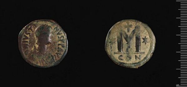 Curator: This is a Follis of Anastasios I, from Constantinople. Editor: It looks small, well-worn. The material feels almost… humble? But the imagery is bold. Curator: Indeed. The "M" on one side is quite prominent; it represents the denomination of 40 nummi. And, of course, the emperor's portrait on the obverse. Editor: So, beyond mere commerce, it's also a propaganda piece, circulating the Emperor's image and, thus, authority. Was this common practice? Curator: Absolutely. Coinage was a primary method of disseminating imperial power throughout the Byzantine empire. The material itself, base metal, reflects the economic realities. Editor: It is an interesting confluence of imperial ambition and the everyday realities of trade. Curator: Precisely. This coin reminds us that even the smallest objects can carry immense political and economic weight. Editor: Thanks to this little coin, we get a small glimpse into a much larger world.