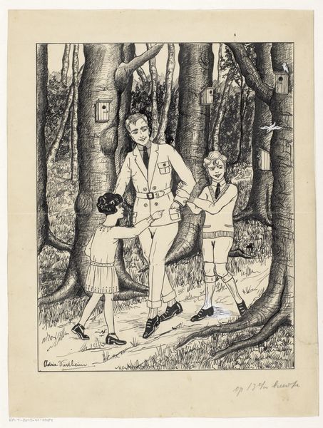 Editor: Here we have "Em lopend onder een boog van bloemen," or "Em Walking Under an Arch of Flowers," a pen and ink drawing from around 1916-1917 by Nelly Spoor. It’s quite charming. What strikes me is the stark contrast between the group and the lone figure, almost like two separate stories unfolding. What do you see in this piece? Curator: I see echoes of rituals, a procession of childhood carrying symbols of life and renewal. The flowers themselves are potent symbols. In many cultures, flowers represent transient beauty, joy, but also mourning. What flowers are they carrying exactly? Editor: They’re hard to make out, but perhaps cherry blossoms or another springtime bloom? Curator: Exactly! These blooms signal renewal. But there’s a deeper, almost melancholic tone created by the lone child standing apart, away from this vibrant procession. What does that evoke in you? Editor: A feeling of exclusion, maybe? Or observation? They seem to be contemplating the joy of the group without participating. Curator: Perhaps. Consider also the broader context. This was created during or just after the First World War. Could that isolated figure represent those left behind, or the loss of innocence in a world consumed by conflict, while the others blindly proceed into new life and happiness? Editor: I hadn’t considered the historical context so directly. It gives the piece a new layer of meaning. It's fascinating how those symbols are inflected by events, turning innocence into something more complicated. Curator: Precisely. Even simple lines, carefully rendered, can hold a universe of cultural memory. It’s these contrasts that create depth, turning a simple sketch into a meditation on life, loss, and resilience.