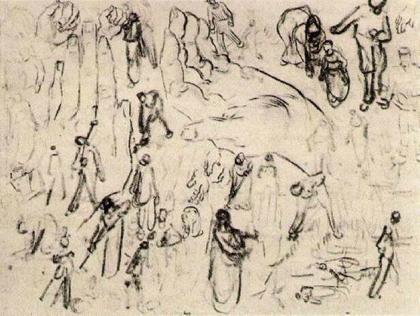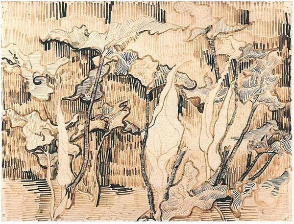 Editor: Here we have Vincent van Gogh's 1890 ink drawing, "Several Figures on a Road with Trees." The sketchiness lends a sort of transient, dreamlike quality to this gathering of people. How would you interpret the composition? Curator: The drawing is a study in contrasts. Observe how Van Gogh uses short, decisive strokes to delineate the figures, rendering them almost monumental, yet they are integrated into the landscape through the echoing patterns in the trees. Note also how line and composition establish meaning. Editor: Can you elaborate on that, about meaning? Curator: Consider the density of line in the lower register in the area occupied by the walking men versus the much sparser arrangement in the depiction of the distant boat, and ponder what is happening in the tonal value. Do these two elements compete or connect formally? Is there tension between the material weightiness in the one versus the light etherality in the other? How is meaning affected in the absence of one or the other of those relationships? Editor: So, you're seeing a deliberate contrast to possibly emphasize their relationship with the earth, while maybe the upper boat conveys freedom? Curator: Perhaps. More compelling for me is the rhythm the image carries from a pointillist sensibility. A consistent patterning and arrangement is pervasive; meaning is delivered through a structured visual grammar. Editor: It’s fascinating how looking closely at the line work and composition reveals new ways to appreciate the piece! Curator: Indeed. Attending to those relationships gives one an aesthetic grasp of the world.