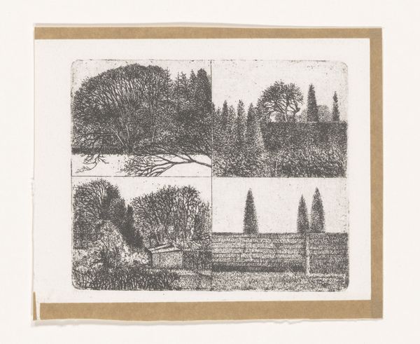 Curator: Here we have Kees Stoop's etching from 1987, "Boom achter hekje," which translates to "Tree behind fence." The work resides here at the Rijksmuseum and employs a variety of drawing and printmaking techniques, notably etching and ink. Editor: My first impression is this fragmentation – it’s almost like looking at a landscape through a fractured lens, each tiny window giving a slightly different perspective. There's a controlled chaos to it that I find really intriguing. Curator: Yes, that fragmentation is quite deliberate. Stoop, in his exploration of realism, presents not one single perspective, but many interlocking views, almost like a photographic contact sheet exploring the possibilities of how we see the tree in its physical context. It evokes the rapid shifts of urban life and the way memory assembles the pieces of lived space. Editor: And what of that "fence?" What are its connotations within Dutch society in 1987? The presence of such an object raises questions of division, ownership, and perhaps even exclusion, both environmental and socio-economic. I’m particularly interested in how Stoop, perhaps unconsciously, speaks to social fragmentation through this grid-like format. Is the tree enclosed, or is it breaking free? Curator: The tree itself has always been symbolically loaded: connecting earth and sky, humanity, and spirituality. To me, its position behind a fence is also commentary on Dutch land use; how even nature is structured, contained, sometimes even possessed within a society structured on private ownership. I see in the tree a potent symbol for environmental struggles of that time. Editor: The date, 1987, is significant, too, coming at a moment of rising ecological awareness globally. Thinking about the AIDS crisis and other socio-political issues brewing at the time, is Stoop using this seemingly pastoral scene to highlight our anxieties, our fragmented understanding of a world in flux? Curator: Precisely! The fragmented presentation mirrors that fractured understanding, a subtle nod to how political forces can shape how we perceive our environment, in all its messy beauty. Editor: It pushes me to question our impulse to compartmentalize and organize. Does this division empower, or further dislocate? Curator: Well said. Ultimately, the artwork pushes us to confront these critical questions, not just of aesthetics but of societal structure, too. Editor: Agreed. Stoop's work makes us mindful that seemingly simple landscapes hold multitudes of questions waiting to be engaged.