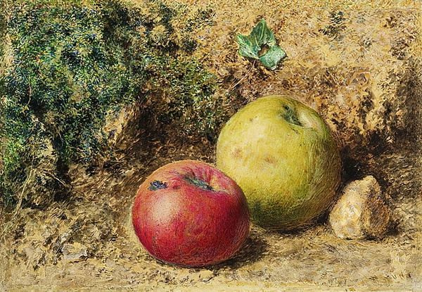 Curator: At first glance, this humble still life appears deceptively simple, but upon closer inspection, the composition reveals itself to be a study of texture, light, and form. Editor: Indeed, there's a striking contrast in textures. William Henry Hunt's "Apples," part of the Tate collection, with the rough, earthy backdrop and the smooth skin of the fruit. Curator: It's not just about the apples themselves, but how they're positioned within their social and environmental context, almost mirroring our relationship to nature. The discarded snail shell adds a layer of allegory. Editor: Perhaps. Hunt was exhibiting during a time when the art market was growing, and still life paintings were increasingly popular among the middle class. This work could be a reflection of a rising consumer culture. Curator: I see it more as a meditation on the ephemeral, where even the most seemingly ordinary objects hold layers of meaning. Editor: Regardless, it’s a testament to Hunt’s skill and the social landscape that shaped artistic preferences in his era. Curator: Absolutely. A fascinating slice of life that transcends its time.