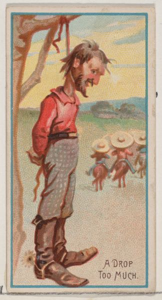 Editor: Here we have "A Great Rent," a print made around 1890 by W. Duke, Sons & Co. The scene shows a boy attempting to climb a post with a dog holding onto his torn clothing below. I’m struck by the humor, but I wonder how viewers at the time would have understood it. How do you interpret this image within its historical context? Curator: It’s fascinating to consider the context in which these cards were produced and circulated. These cards, included in cigarette packs, acted as a form of advertising and, in a sense, democratized art. They put images in the hands of a wide audience. What do you think of the subject of the picture? Editor: The picture is humorous, but I do not understand why they include a kid climbing a pole being menaced by a dog, or the meaning behind the title: "A Great Rent." Curator: "A Great Rent" most likely refers to the torn garment in the dog’s mouth. Genre paintings often romanticized everyday life and appealed to the burgeoning middle class. The rise of consumer culture also encouraged such forms of entertainment and the wide spread availability of consumer goods. Do you believe the picture carries social commentary? Editor: Possibly, through the depiction of this boy's situation or interaction with the dog. He is perhaps an impoverished youth, who might have trouble paying for the damage inflicted on his garments by the family dog. However, considering this card would have appealed to children and adults, it does not suggest a particular moral reading. Curator: Precisely! While seemingly simple, such images offered viewers a shared cultural touchstone, promoting both the product and a certain idealized view of everyday life accessible to all. So the value is found on a kind of a leveling effect for a rising middle-class. Editor: That's a really helpful perspective. I’ll definitely consider how the cultural and economic climate influenced the image's production and reception moving forward. Curator: And I learned from you! Your analysis on how it applies to consumers of all kind opens it up further than I'd thought about previously!