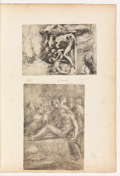 Editor: So this is Andrea Schiavone's "Rebecca and Eleazer at the Well," made sometime between 1540 and 1550. It's an etching, right? There's a lot going on, it’s pretty densely packed with figures. What stands out to you about this print? Curator: This scene presents the biblical story with remarkable visual economy. Observe how the artist uses the well not only as a compositional anchor but also as a potent symbol. What meanings might water carry in this context? Editor: Well, it's life-giving, essential. And isn't the sharing of water a sign of hospitality, especially in that time? Curator: Precisely. The act of offering water embodies charity and foreshadows Rebecca's virtues, soon to make her Isaac’s wife. Schiavone invites us to decode social and spiritual values embedded within simple, everyday gestures. Consider, too, the prominence of animals. What might they signify? Editor: Hmmm… faithfulness? The dog at the bottom looks pretty loyal. Curator: Yes, and also consider the camel train hinted at in the background, representing wealth and the long journey ahead. Think about how the imagery emphasizes movement. Can you see a narrative being woven through symbols of travel, welcome, and shared resources? Editor: I think I'm starting to! It's more than just a depiction; it's about deeper values expressed visually. Curator: Schiavone masterfully condenses the entire narrative into a single image. The anticipation, generosity, and future possibilities are all encapsulated within this seemingly simple scene. Editor: I'll definitely look at etchings differently from now on. Thanks for pointing out those symbolic details. Curator: My pleasure. Every line in this etching, like echoes from cultural memory, enhances our reading of the text.