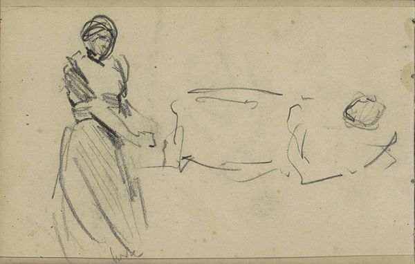 Curator: Looking at this quick sketch, I feel a sense of profound melancholy and tenderness, something fragile and fleeting captured in ink. Editor: Indeed. This is "Sappho og Mytilenerinden," created between 1807 and 1808 by Nicolai Abildgaard. It’s held at the SMK, Statens Museum for Kunst, and done with light pencil work in pen and ink on toned paper. I wonder, how might we interpret it through the lens of its materials? The paper itself, for example, dictated certain possibilities for Abildgaard. Curator: Absolutely, the toned paper provides an immediate ground, eliminating the stark white. This wasn't a grand commission, but rather seems to emerge from personal exploration, maybe a storyboard sketch done in preparation for larger-scale work. You get the sense it's less about finalized imagery, and more an act of production: how he is developing this story. Editor: Right, and contextually, the story itself—Sappho, the famed poet of Lesbos, in an intimate moment. We might ask what made this subject palatable, even desirable, for an early 19th-century Danish audience. How did Abildgaard's presentation of it either challenge or conform to prevailing social attitudes of his time towards female same-sex relationships, especially through the art institutions which mediated its display and the wider public discourse? Curator: And you also sense Abildgaard considering Sappho’s profession, a musical instrument is next to her as the source and engine to a deeply individual artistry. Perhaps an appeal, beyond accepted historical parameters of its display and more, into an exploration of artistic labor itself, a consideration of what goes into making things. What that kind of personal expression demands of the artist. Editor: This small work, then, becomes more than just an image, and speaks volumes about how stories and production become meaningful. Curator: A material consideration as well: Abildgaard captures her interior life. A powerful message when reframed around gender, history, and art-making itself.