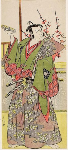 Curator: Here we see "Actor Ichikawa Danjuro 5th as a Samurai" by Katsukawa Shunko, housed right here at Harvard Art Museums. Editor: The color palette is unexpectedly soft, almost muted, given the subject matter of a samurai. It’s rather calming. Curator: Indeed. Shunkō, known for his actor portraits, likely used woodblock printing, a process demanding skilled artisans to carve and print each color layer. The materiality itself speaks to a collaboration, a social endeavor. Editor: And the figure’s posture! It’s more like a contemplative bow than a battle-ready stance. It seems to subvert stereotypical notions of masculinity and power. Curator: Perhaps Shunkō aimed to capture the actor's persona, not just a literal depiction of a samurai. These prints were, in essence, a form of popular culture, consumed and circulated widely. Editor: Which makes you wonder: How did the representation of powerful figures like samurais influence the broader social imaginary and power dynamics of the time? Curator: Food for thought, certainly. A fascinating interplay between performance, identity, and material culture. Editor: It prompts questions about the very construction of the samurai image, then and now.