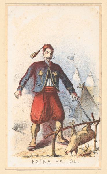 Editor: Here we have "Admiral, France," one of the Naval Flags series from Allen & Ginter Cigarettes, dating from around 1886 to 1891. It's a small print, quite detailed. I'm struck by how the vibrant flag dominates the composition, almost flattening the depth of the naval scene below. What do you see as the defining characteristics of this print? Curator: Indeed, the two-dimensionality is quite pronounced, achieved primarily through color blocking and the lack of traditional perspective. Observe how the red, white, and blue of the French flag are rendered as distinct, unmodulated fields, creating a striking visual impact. Even the ship below appears stylized. Notice also the way the stippling effect mimics both sky and water. The print asks us to focus on surface and pattern. How do these design elements relate? Editor: I see your point about the surface, but what is the role of text? Doesn't it flatten out the work even further? Curator: Precisely. The inscription, "Admiral, France," functions less as a descriptor and more as an integrated graphic element. It further denies any illusionistic depth. This contributes to the work’s formal tension, a push and pull between representation and pure design. Notice that the flag in the background repeats the shape of the rectangle. What kind of rhythm do you perceive in the layering of similar forms and colors in distinct registers? Editor: It creates an echo that pulls the whole image together, tying the parts to a tight whole. Curator: Precisely. Now, let's consider what this artwork has revealed about relationships between form and function in late nineteenth-century commercial art. Editor: It’s amazing how much one can see by looking so closely. I will start there in the future.